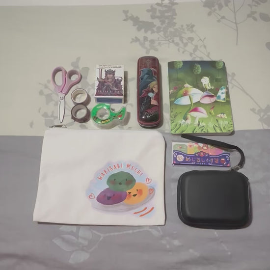 A large and sturdy 10" x 8" cotton zipper pouch featuring our adorable Mochi Friends from the WabiSabi Mochi collection! Fit everything from your marker collection, small notebooks and pencil cases to your favorite foldable headphones, external hard drive cases or glasses cases in this adorable, durable pouch.
